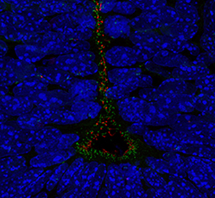 They also added a fluorescent tag to a molecule only found in primary cilia, making them look red. With this they’re able to see the cilia reaching out from cells like fingers to sense what’s going on around them.